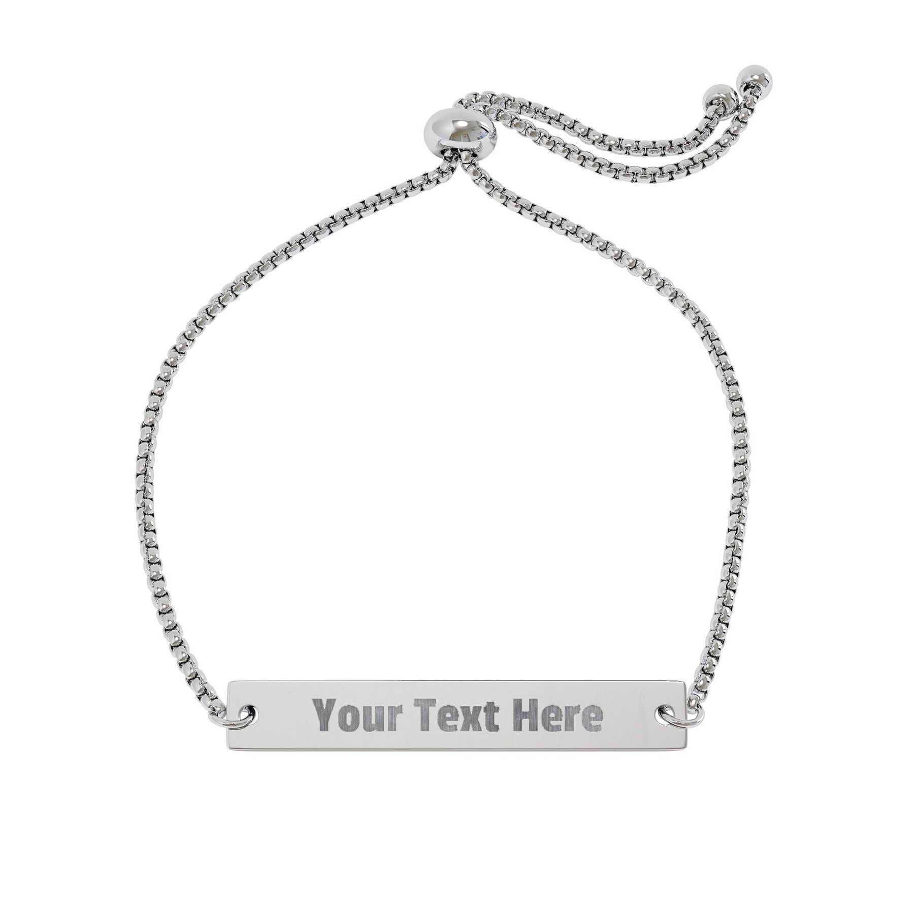 The Engraved Adjustable Flat Bar Bracelet features a sleek rectangular bar designed for personalized engraving. Add a name, meaningful date, or short phrase up to 30 characters to create a piece that reflects your story. This Engraved Adjustable Flat Bar Bracelet offers a clean, minimalist design that works well for both everyday wear and thoughtful gifting.